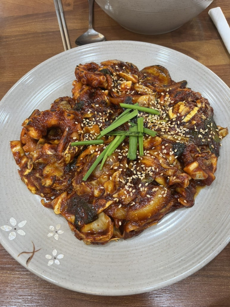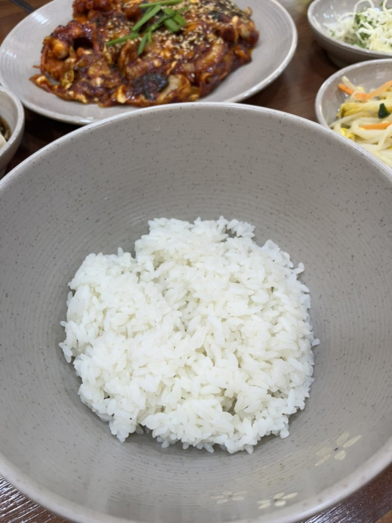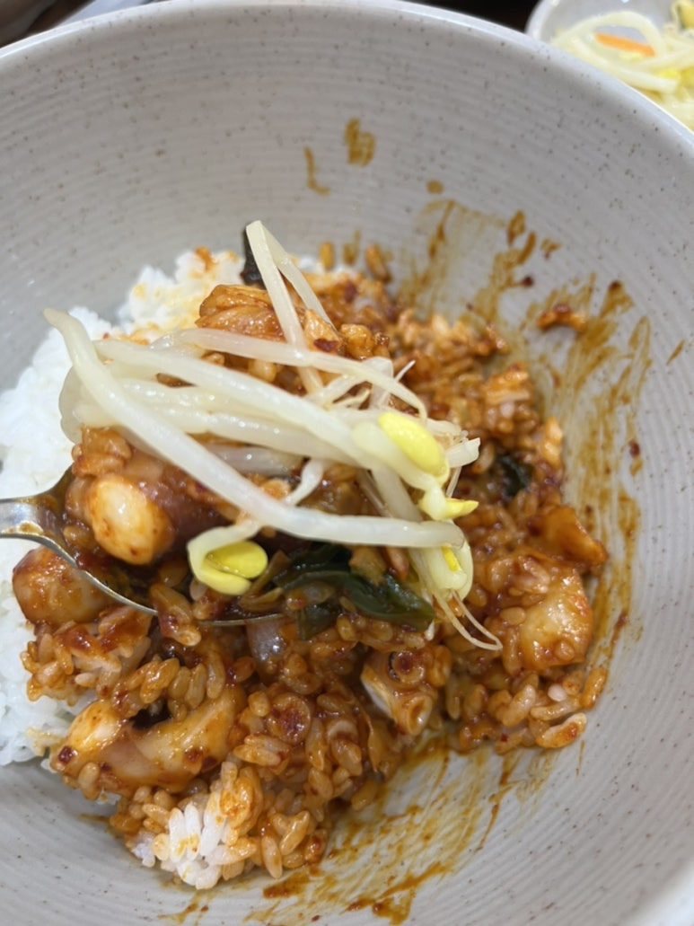 낙지가 오동통하고 양념이 잘 베여있다ㅠㅠ 불향도 나구,, 맛있게 매콤함! (매워도 냉국이나 순두부 먹으면 괜찮아유) 우리는 항상 기본으로 먹었는데 맵기조절이 되는 것 같더군