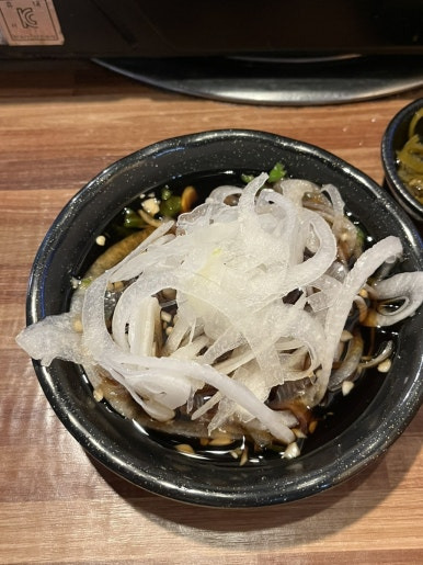 양파 파절이에 백김치, 알배추, 생당근 등이 기본으로 나오고 우리는 요기에 냠 하면서 술 한모금 먼저 하고 있었음 ㅎ..ㅎ
