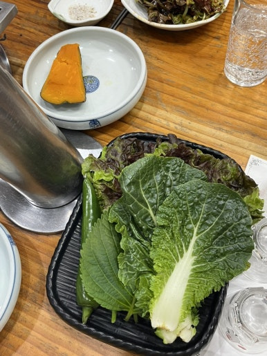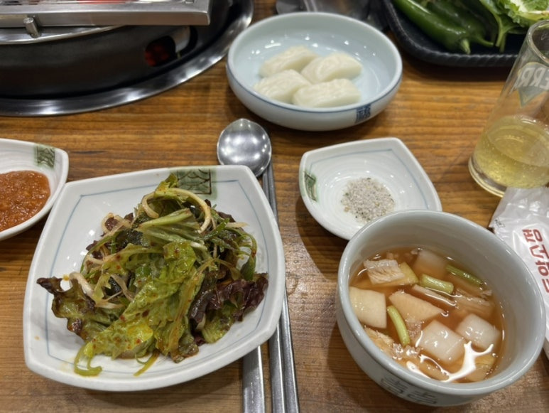 얼큰하고 칼칼한 (맵지 않음) 고기집의 정석 된장찌개 였는데 국물이 진 - 해서 계속 고기 먹고 느끼한 속을 풀 수 있는 맛이었다 이 날 언니가 이 국물 먹고 좋다고 소주를 먹지 못한 아쉬움을 살짝쿵 내비쳤다