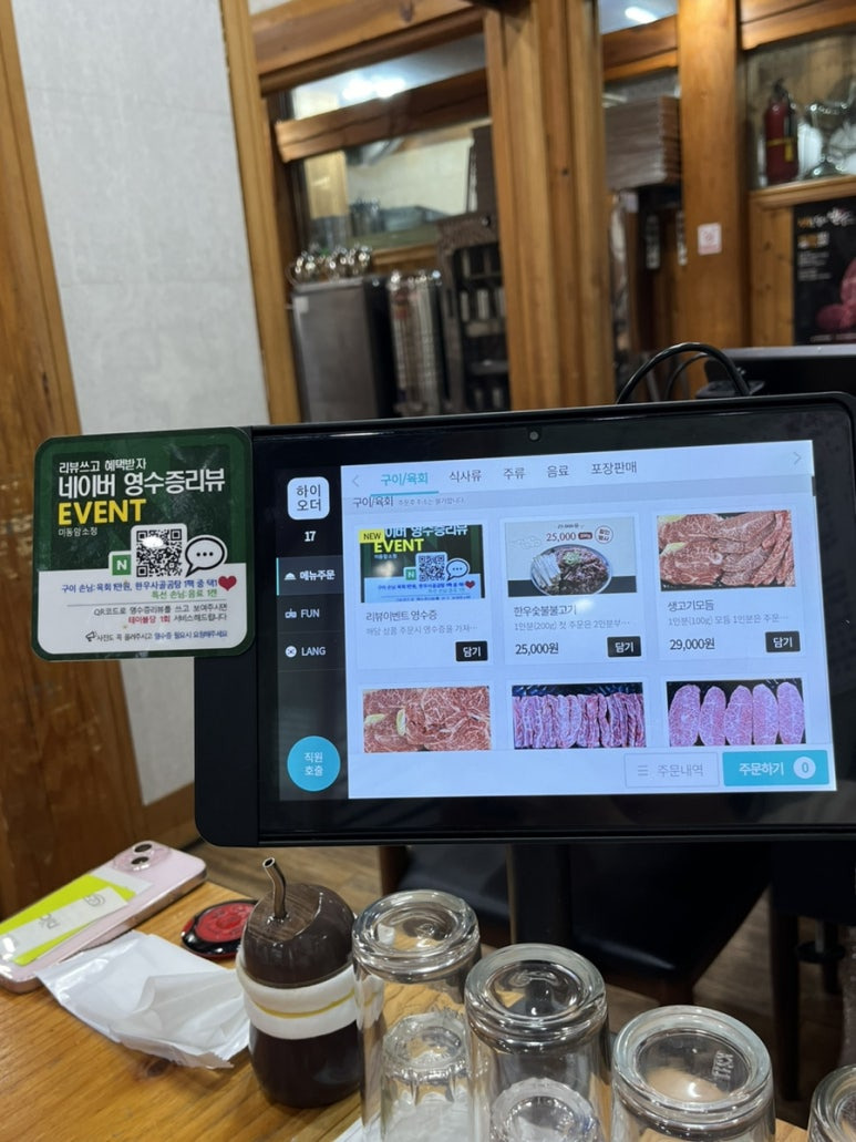 주문은 태블릿으로 하면 된다 ! 네이버 영수증 리뷰 이벤트도 하고 있으니 다들 참여하시라 육회 1만원 or 사골곰탕 1팩을 얻을 수 있다 ( 정작 나는 사골곰탕 해놓고 안챙겨옴.....하..)