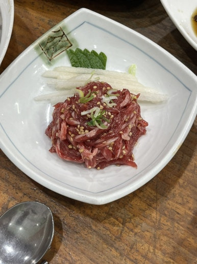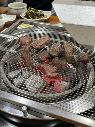 같이 먹을 기본 반찬이 매우 다양해서 좋다 시원한 동치미 국물부터 파채, 쌈, 장아찌류, 명이 나물, 샐러드, 천엽, 선지, 내가 너무 먹고싶어했던 육회까지 정갈하게 나온다 맛있기까지 함.. 육회 맛 미쳤어여..