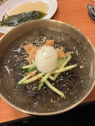 냉면은 또 왤케 맛있는지...? 남편이 시킨건데 계속 뺏어먹음... 미안 자기야... 시원하니 따뜻한 고기랑 같이 먹기에 너무 좋았음 국물도 시 - 원 이렇게 맛있을 줄 알았으면 2개 시킬껄.... 후회했을 정도로 맛있어서 전 좋았어요 (식초 겨자 필요없이 기본 자체가 맛있었음!)