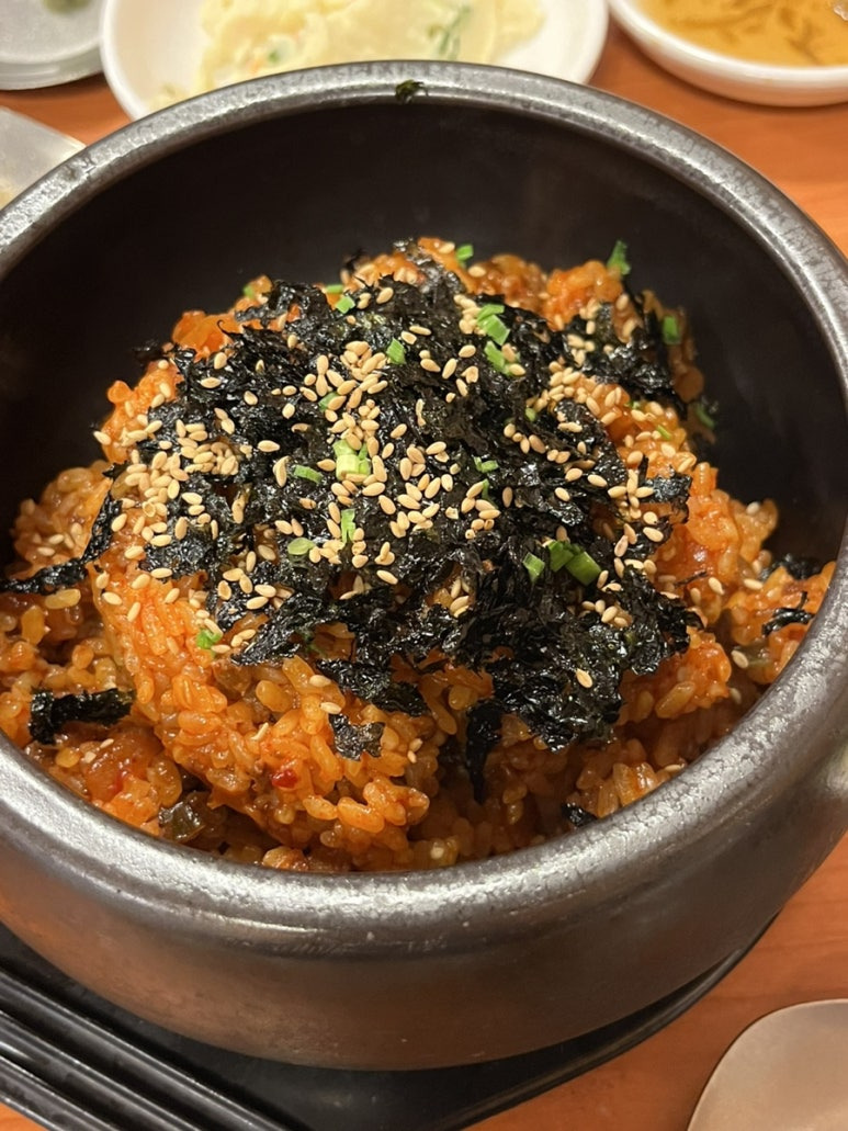 처음 나왔을 때는 고기집 된장찌개의 그 진 - 한 된찌의 느낌이 아니라 청국장 베이스 같아서 음 ? 했는데 먹으면 먹을수록 손이 갈 만큼 중독적이고 안에 두부, 애호백, 버섯, 채소가 많이 들어가있어서 열심히 퍼먹었다 먹으면 먹을 수록 더 맛있고 진하다 우리는 볶음밥 시켜서 공기밥 안시켰었는데, 공기밥에 먹었으면 더 맛있었을거라고 결론 내림