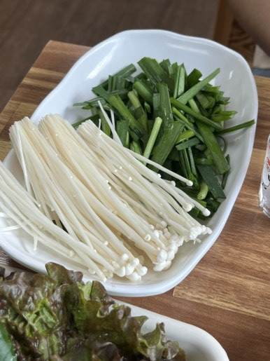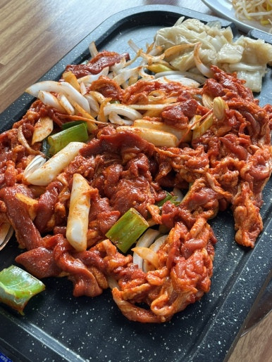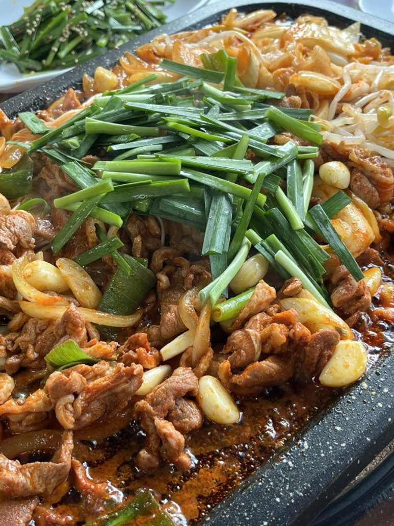 먹었는데 너무 맛있어서 감동의 무한 먹기... 그래서 고기 사진은 더 없습니다. 양념도 맵지도 않은데 느끼하지도 않고 달달하니 양념이 알맞고 고기에 쫙 베여서 대파랑 마늘이랑 맛있게 먹고 쌈도 싸먹고 행복한 한상이었다 콩나물도 김치도 완벽해 🥰