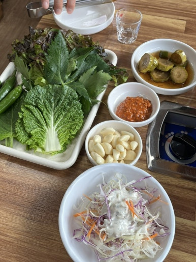밑반찬 보고 감탄을 금치 못했던 이유 : 신선한 야채를 퍼줘서.. 요즘 야채 금값인데.... 쌈도 케일부터 당귀, 상추, 깻잎에다가 상추겉절이 양파절임, 샐러드, 피클까지 다 야무지게 나와서.. 맛있기까지 했음 ㅠㅠ 최고