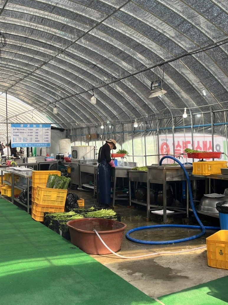 길다란 비닐하우스 안으로 들어가면 테이블이 무수히 많이있음 ! 사람들이 꽉 차 있어서 우리 테이블만 공개