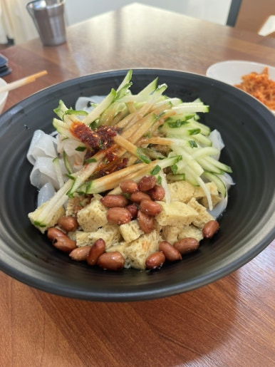 고추기름 베이스 양념에 두부, 땅콩, 오이, 시원한 면이 어우러져있숨 ! 섞고나서는 먹느라 사진이 없긴한데 굉장히 이색적인 맛임!! 분모자 당면도 아닌것이 비슷한 묵같은 당면맛에 매콤달콤하면서도 시원한 면이 색다른 느낌 ㅋㅋㅋㅋ 나는 앞접시에 덜어서 고추기름이랑 식초 더 섞었더니 더 매콤달콤 ‼️