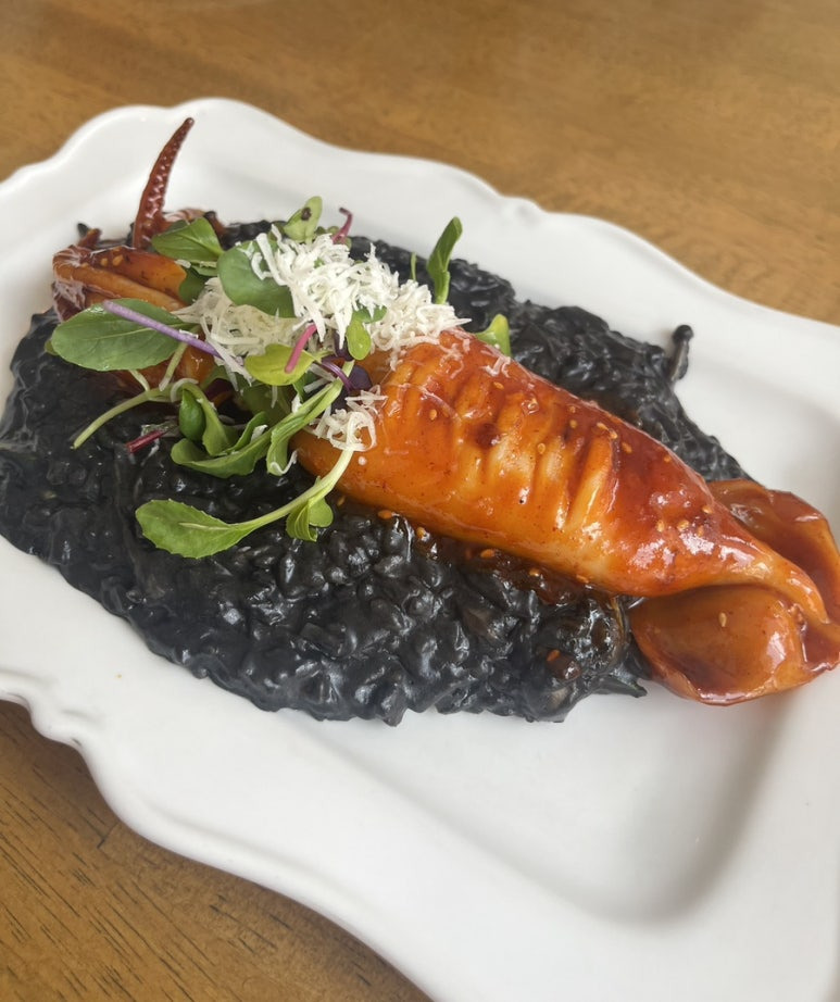 오징어가 매우 매콤한 양념에 버물어져있는데 먹물 리소또에 올려먹으면 조합이 굿굿