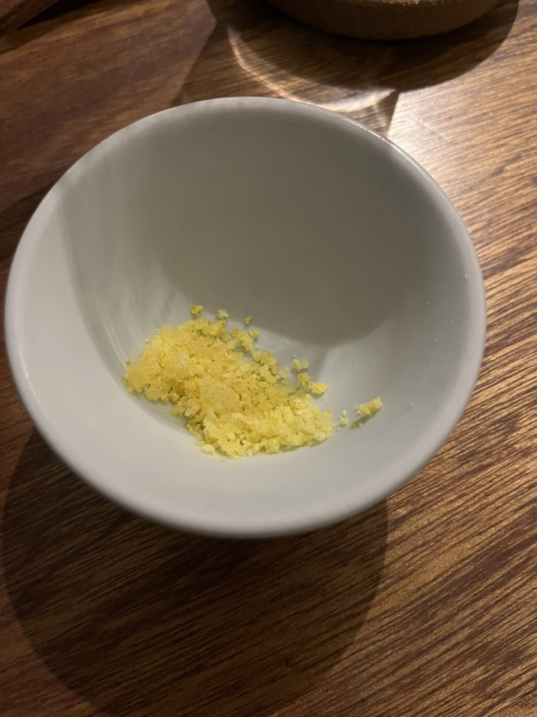 고등어소면 다 먹을 때 쯤 이 가루를 뿌려 또 먹어보라고 하심 저 국물에 유자향이 가득 퍼져 또 색다른 맛! 뭔가 마무리 되는 맛 😎